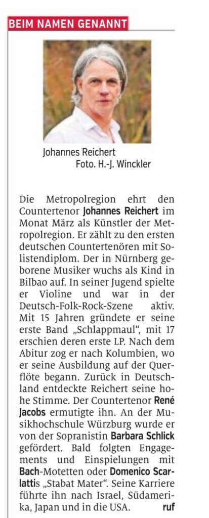 Was könnte ein neues Projekt für Johannes Reichert sein? „Der Nürnberger Barockmusiker Johann Philipp Krieger fasziniert mich seit meinen sängerischen Anfängen. Aktuell beschäftige ich mich sehr mit seinen seit Jahren recherchierten Liedern für meine Stimmlage. Vielleicht ergibt sich daraus eine neue Produktion.“